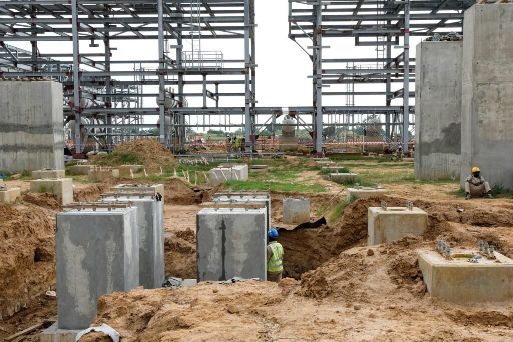 Des employés de Sinopec sur le chantier de la centrale de traitement du champ pétrolier de Tilenga, à Bullisa, en Ouganda, le 13 août 2025.